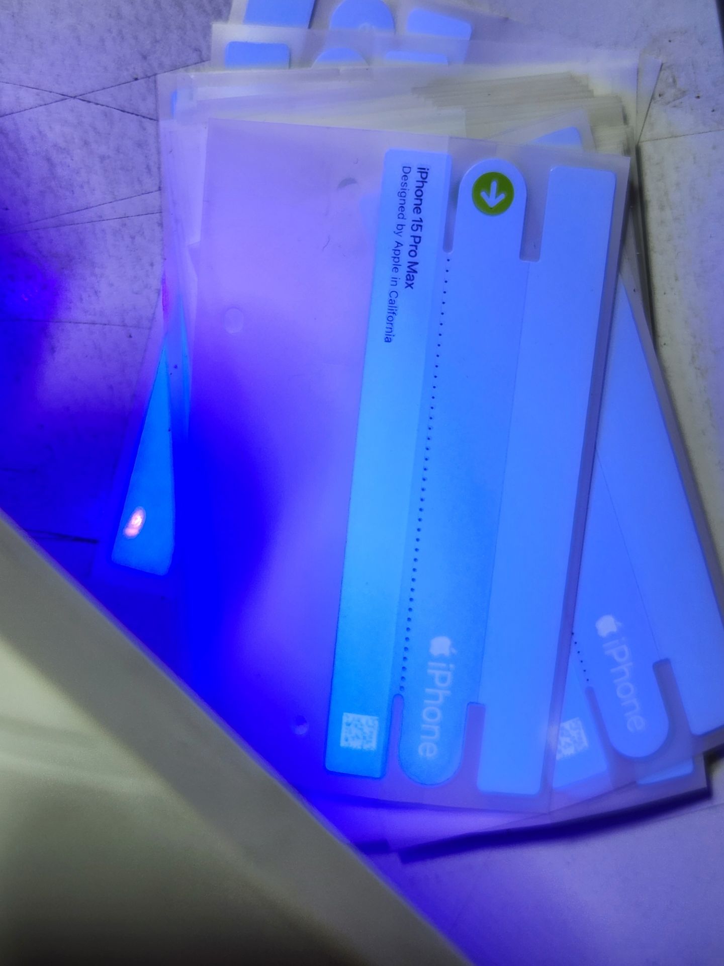 لیبل پلمپ آیفون 15 پرومکس اورجینال، که در زیر اشعه UV هم لوگوی اپل کامل مشخص میشه